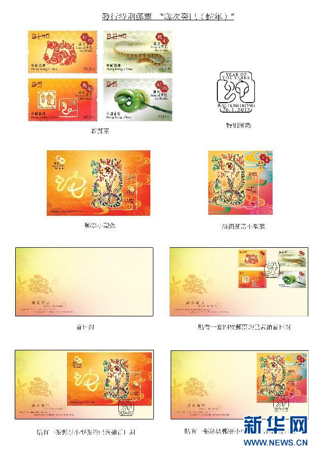 ??? 這是“歲次癸巳(蛇年)”特別郵票、絲綢郵票小型張及首日封等。 1月12日,香港郵政宣布,一套以“歲次癸巳(蛇年)”為題的特別郵票和相關郵品將于1月26日推出發售。 (新華社發)