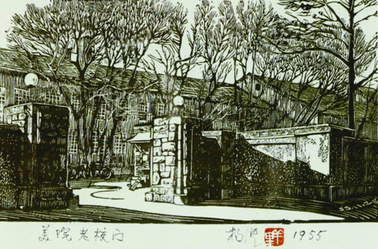 60年過去了,學校早已遷到城外寬敞的新校區,老校址拆遷,變成協和醫院的新病房樓。我刻的《美院老校門》變成校友回憶母校的紀念品,上世紀80年代中央美術學院美術館收藏了一幅并幾次展出。李樹聲先生收到一幅復制品(木板有損)后感慨地說:“在里邊住了46年!太有感情了。”李可染先生、師母鄒佩珠先生見到后也說:“老美院,太熟悉,感情很深啊!”老校園里有徐悲鴻、吳作人老院長的身影,有齊白石老人上課的痕跡,有李可染、李苦禪、李樺、古元等老一代宗師授課的回音。