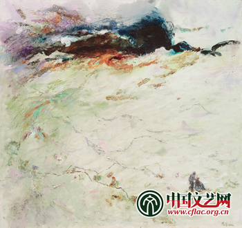 在油畫中引入水墨意象與線條之美,是中國油畫家對油畫這一外來藝術的獨特貢獻,歐洋的《蹉跎歲月》,徐福厚的《大視野》、翁凱旋的《雪融系列》,金長征的《祈》、李江峰的《化象成境——松之三》、胡大虎的《曉雪》,周建捷的《前村煙樹》、宋玉《秋天的胡楊》、張淳大寶的《松與石》等作品,都呈現了畫家對中國水墨畫的韻味及線條之美的理解和借鑒。他們的作品或研討線條的敏感,或著力于黑白的韻律,或試驗皴擦的肌理,趙培智的《羈旅-馬爾楊》、黃于綱的《求全的母親和孩子》、藍威的《何處西風》,則運用大寫意的豪放筆觸,將書法性的用筆引入油畫語言的試驗空間。