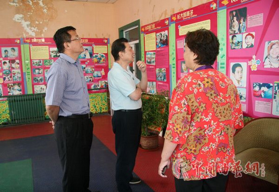 中國(guó)曲協(xié)分黨組成員、副秘書長(zhǎng)曲華江,相聲表演藝術(shù)家常貴田聽“太陽村”的張淑琴主任講解