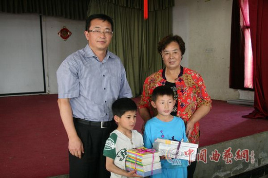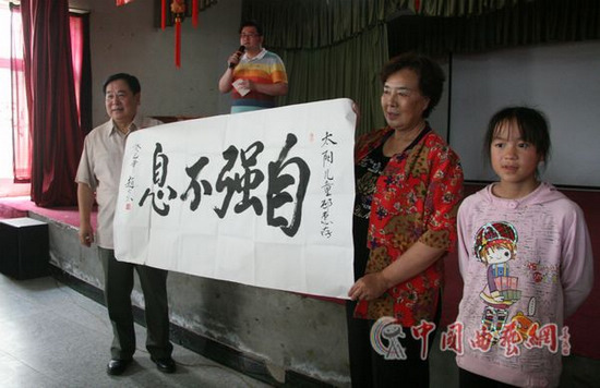 中國(guó)曲協(xié)分黨組成員、副秘書長(zhǎng)曲華江代表中國(guó)曲藝家協(xié)會(huì)向太陽村捐贈(zèng)了書籍。相聲表演藝術(shù)家趙炎把自己手書的“自強(qiáng)不息”書法力作送給了孩子們,鼓勵(lì)他們健康成長(zhǎng)。