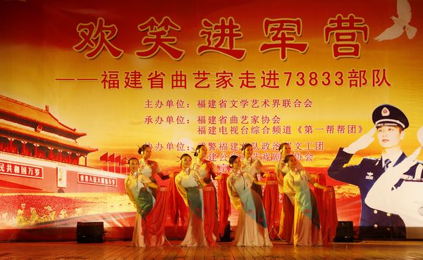 73881部隊和73833部隊首長、福建省文聯(lián)、省文化廳等領(lǐng)導(dǎo)與官兵們一道觀看了演出。來自武警福建總隊政治部文工團、福建公安曲藝戲劇家協(xié)會、福建京劇院、福州市曲藝團、南平南詞傳承藝術(shù)中心、福州經(jīng)濟技術(shù)開發(fā)區(qū)歌舞團等單位的80余位演職人員參加了演出。