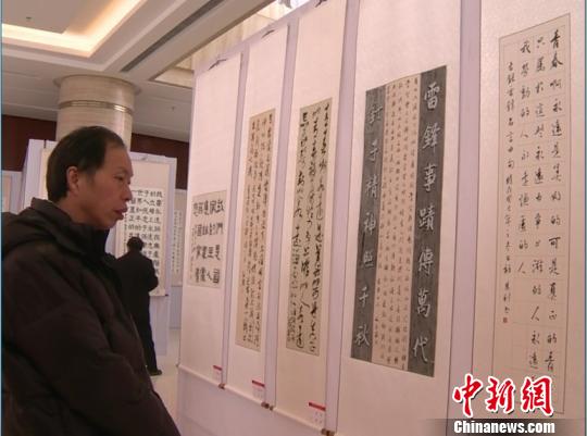 “書寫偉大的人生”書法作品展26日在遼寧省撫順市雷鋒大劇院舉辦,圖為市民參觀書法作品。 張曼 攝
