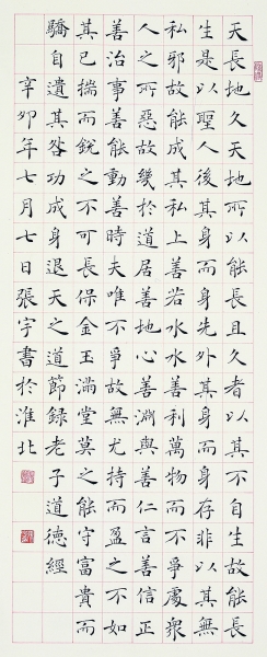 我把張宇的楷書歸類為工。所謂工,就是精工細(xì)作,苦心經(jīng)營。說張宇楷書之工,并非指用筆結(jié)字刻板呆滯,而是點(diǎn)畫空靈而富有變化。張宇楷書之工,還體現(xiàn)一種形式典型的審美規(guī)律。泱泱數(shù)卷,工楷萬字,沒有絲毫雜質(zhì),沒有半點(diǎn)草率。工源于滿整端直,安靜敦重的方正。方正是書法藝術(shù)體勢和用筆風(fēng)格的體現(xiàn)。早在商代,人們對來自現(xiàn)實(shí)生活中的方形,就有親切的感知和熱烈的關(guān)注。先民的觀照視域,方形既是直觀的感性的,也是概括的理性的。方則止,表現(xiàn)出一種靜態(tài)之勢。方者矩形,其勢也自安,表明方在人們的視覺中有著安靜之態(tài)。從空間上來說,方正確實(shí)具有端莊的形狀,靜止的態(tài)勢。“至靜而德方”,方正蘊(yùn)藏著安貞厚德的品格。方正滲透著中華文化哲學(xué)的深刻內(nèi)涵,不僅體現(xiàn)于書法的結(jié)體和用筆,而且廣泛應(yīng)用于藝術(shù)品的鑒賞和品評。在書法美的領(lǐng)域里,方正確實(shí)具有端直、嚴(yán)正、滿密、整齊、安貞、敦厚等美的特質(zhì)。