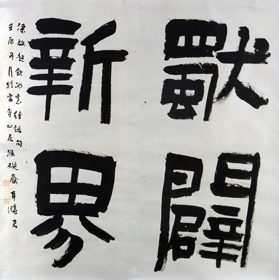 羊曉君選擇隸書作為自己的主攻方向,圍繞“高古”二字做文章,不摻時流,但又能“守道不封己”,遵循藝術原則,善學苦練,自然出新。他的創作借鑒篆籀之意,充分體現古雅雄逸的自然韻度。并且,羊曉君寫隸,并不在意點畫的謹飭工細,而是放筆縱橫自然連貫,并不刻意雕琢,卻充分展示柔軟筆鋒在運行中的流宕與蒼莽。在氣度上,則繼承了漢隸的宏大雍容。應當說,羊曉君是深得漢魏碑誌運筆流動與爽健之三昧的,從而在質樸簡約中保持了對技巧的輕松把握和自如運用。正因為如此,他的隸書在面目上并不拘泥于與某碑或與某家相似,但在整體氣息上則繼承了漢碑隸書的審美特征。