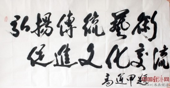 中國文聯(lián)原副主席高運甲為中國經(jīng)濟網(wǎng)書畫頻道題寫《弘揚傳統(tǒng)藝術(shù) 促進文化交流》 中國經(jīng)濟網(wǎng)記者李冬陽/攝