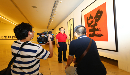 羊曉君隸書展受到臺灣媒體關注,圖為羊曉君接受記者采訪 黃勇敏攝
