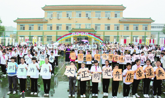 5月28日,涼爽的蒙蒙細雨中,百余名愛好書法的小學生手握毛筆寫大字,共同書寫“書山有路勤為徑、學海無涯苦作舟”、“海納百川”、“陽光心態、活潑向上”等積極勉勵的詞句。小雨并沒有影響孩子們的書寫熱情,從他們的笑臉上,從他們的筆意中流露出對書法真摯的喜愛之情。這是北京朝陽區青少年活動中心書法學校的老師們與定辛莊小學書法社團,共同開展“放飛夢想”書法展示與交流活動的場景。主辦方以這種特殊的形式為喜愛書法的孩子們提前慶祝即將到來的“六·一”兒童節。學生們還在現場分組為到場嘉賓和家長們介紹書法常識,講解展示的書法作品,還送上展示自己硬筆書法的自制書簽?;顒蝇F場以學生為主體,老師和家長參與其中,體現了學?!耙詫W生為本,學生和家長共同參與,與學校共同成長”的辦學宗旨。
