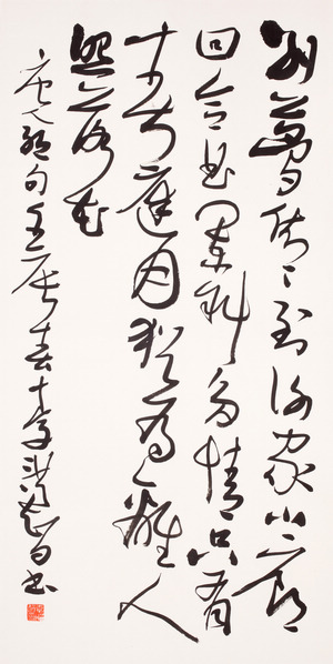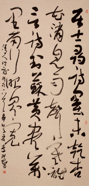 與以往書法展不同,本次“墨痕——李洪智書法展”展出的是近十年李洪智教授創(chuàng)作的50多幅書法佳作。受恩師啟功先生影響,李洪智一直對(duì)古文字有很深的研究,這種學(xué)養(yǎng)的積淀,使得他的草書動(dòng)如行云流水,靜似青松蒼勁雄厚,大氣磅礴,龍伸蠼屈。在表現(xiàn)形式上,他的章法布局相當(dāng)舒朗,使作品簡(jiǎn)單純凈而又富有動(dòng)感。