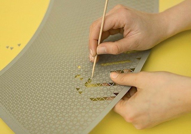 來自德國工作室fifti-fifti的創意,多變臺燈(Take-off Light)的燈罩是兩張通過激光切割技術進行加工的紙,用戶可以自行取掉固定的形狀做出鏤空圖案,組成多種風格的燈罩設計。從而制造出近乎無窮的光影形狀來。