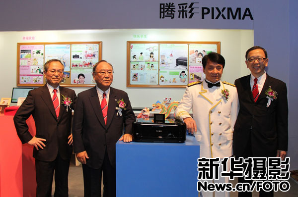 ??? (左至右)佳能公司總裁內田恒二、佳能公司董事會主席御手洗冨士夫、佳能EXPO形象大使成龍、佳能亞洲營銷集團總裁、佳能(中國)有限公司總裁小澤秀樹合影