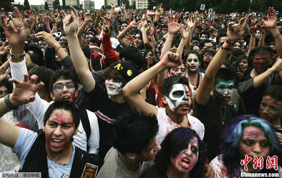 當(dāng)?shù)貢r(shí)間11月26日,墨西哥民眾舉行“僵尸大游行”,近萬(wàn)人裝扮成各式各樣的“僵尸”在廣場(chǎng)上聚集。登記參加這次大游行的人共有9860人,主辦方期望打破僵尸游行最多參與人數(shù)的吉尼斯世界紀(jì)錄。