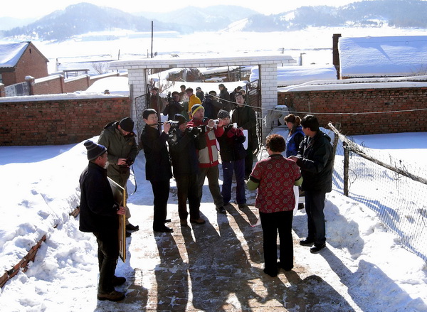 雞冠山鄉地處鐵嶺市東部偏遠山區,當天雪花飄舞,氣溫零下25度。由省文聯黨組成員、副主席伊忱帶隊,攝協主席劉志超,副主席、秘書長魯文等一行15人來到大雪覆蓋的鐵嶺縣雞冠山鄉岱海寨村,為這里村民帶來了他們每人精心準備的一幅幅裝裱精美的攝影作品及年畫等慰問品。攝影家們冒著嚴寒不顧旅途疲勞,下車就分別走進楊玉庭等五戶軍屬及低保家庭。他們一邊送慰問品一邊與老鄉合影留念并同他們親切交流。老鄉們笑逐顏開忙里忙外,就像過年一樣接待遠方來的客人。山里風很冷,但這里氣氛很溫暖。