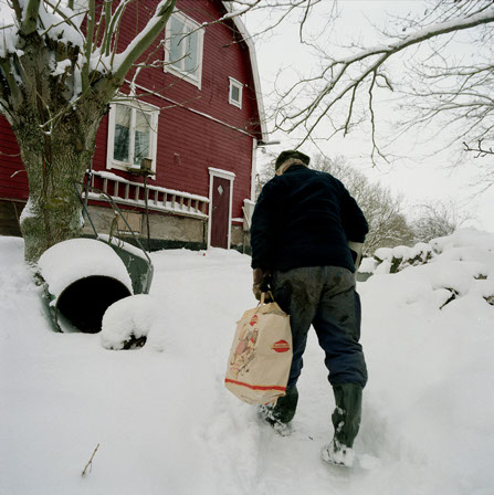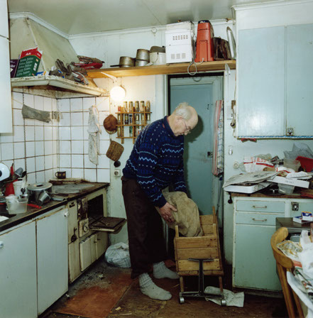彼得·德·魯(Peter de Ru)拍攝的這位叫做Sven的老人,運(yùn)用方畫幅以及質(zhì)樸的記錄手法,描繪了老人生活中的點(diǎn)點(diǎn)滴滴,透過(guò)這些片段,還原了一個(gè)孤獨(dú)老者的生活狀態(tài):從他采收的蘋果、丟棄的廢電池、寫滿了各種標(biāo)記的日歷牌,到他穿著滿是污漬的工作裝在起居室看報(bào)、在電視旁修補(bǔ)漁網(wǎng),在凌亂的廚房里準(zhǔn)備冬日的儲(chǔ)藏,觀看者由 此構(gòu)建起自己的印象,關(guān)于這個(gè)老人,關(guān)于他生活的環(huán)境。我們看不到老人生活中還有其他家人的影子。單純從照片來(lái)看,我們可以想象這是北歐典型的孤獨(dú)老人的生活。