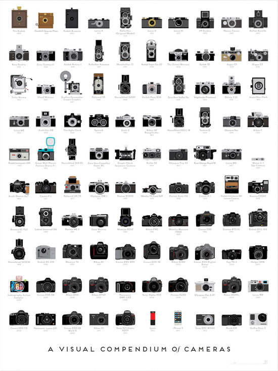 如果要細數歷史上最重要的100款相機,相信都很難有個完美的答案吧?來自Pop Chart Lab設計的海報,列舉了自1888年柯達第一臺相機誕生起,到2013年100款具有歷史意義的相機,看看里面有沒有你心目中的選擇?