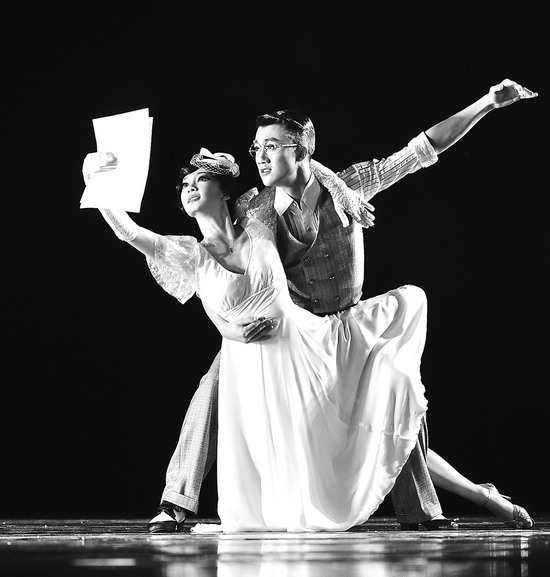 在這次劇目課匯報中,雙人舞作品《再別康橋》在創編中將人物細膩豐富的情感與國標舞元素相融合,呈現了徐志摩與林徽因唯美的愛情故事。正如那句“輕輕地我走了/正如我輕輕地來/我揮一揮衣袖/不帶走一片云彩”表達了徐志摩對康橋的愛戀,對往昔生活的留戀,對眼前的無可奈何的離愁。舞蹈表現得真摯、雋永,畫面唯美,情感絲絲入扣。整個作品從林徽因撿到徐志摩的情詩開始,表現林徽因暗戀時的青澀、純真,到遇見徐志摩時內心的喜悅和害羞,再到兩人一起讀詩時的快樂、彼此喜歡,直到最后兩人分開,徐志摩無情的離去……