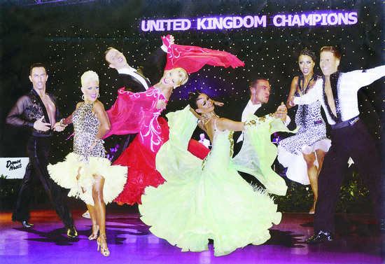 2013英國UK公開錦標賽冠軍榜(從左至右):職業(yè)拉丁冠軍——邁克爾·馬里托夫斯基/喬安娜·路尼斯(英國)、職業(yè)摩登冠軍——阿魯納斯·畢索卡斯/喀秋莎·德米多娃(美國)、業(yè)余摩登冠軍——馬雷克·科沙季/寶琳娜·格拉齊克(波蘭)、業(yè)余拉丁冠軍——尼爾·瓊斯/葉卡捷琳娜·索科洛娃(英國)