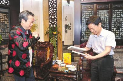 8月25日,成都,柳忠秧(左)贈送詩集給周嘯天(右),請他多指教。