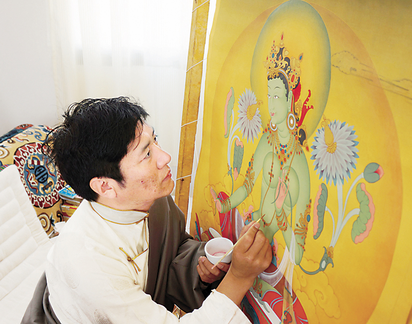 多派唐卡,是多吉頓珠創(chuàng)立的一個(gè)派系,以他名字多吉頓珠最前面一個(gè)字“多”字,命名為“多派唐卡”。唐卡是西藏的文化名片。也可以這么說,在所有的民族里,唐卡是唯一可以代表自己民族和信仰的一種藝術(shù)。然而,活在當(dāng)下的我們,對(duì)唐卡藝術(shù)卻知之甚少,或只略識(shí)皮毛。我曾無數(shù)次叩問自己,為何我?guī)状巫哌M(jìn)西藏,卻在今天才知道什么是唐卡?我們不能回避當(dāng)代。對(duì)于藝術(shù)與文學(xué),太多的人在說話,卻沒有人聽。每個(gè)人都活得心亂如麻,亂糟糟、心浮氣躁,這是個(gè)有待于歸位命名的時(shí)代。在這個(gè)紛亂的世界里,我們迫切地需要內(nèi)心,需要精神。而唐卡一直在那里。