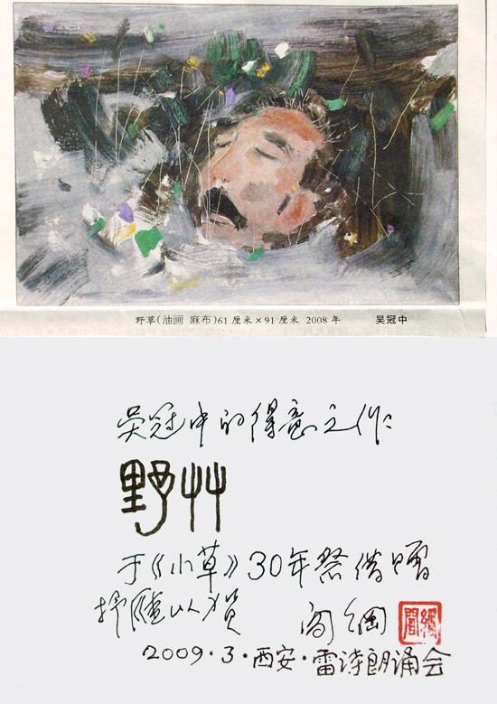 雷抒雁是新時期以來,繼他崇拜的艾青之后杰出的詩人,我為他慶幸。西安那天,借花獻佛,贈他一幅油畫(剪貼),上寫: