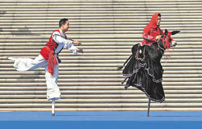 演員在開幕式上表演高蹺“趕犟驢”。新華社記者 劉 瀟攝