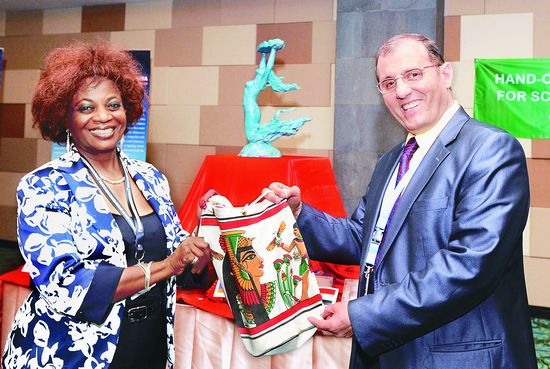 來自非洲的聯合國環境規劃署官員展示來自埃及金字塔的巖石和土壤樣品