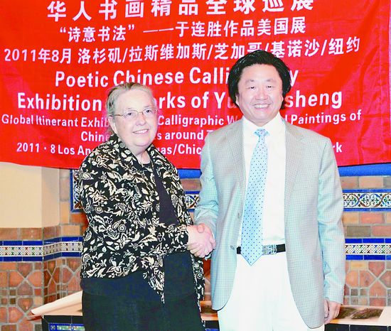 第31屆世界詩人大會執行主席、世界和平文化大使瑪麗安在詩意書法展上同于連勝會晤
