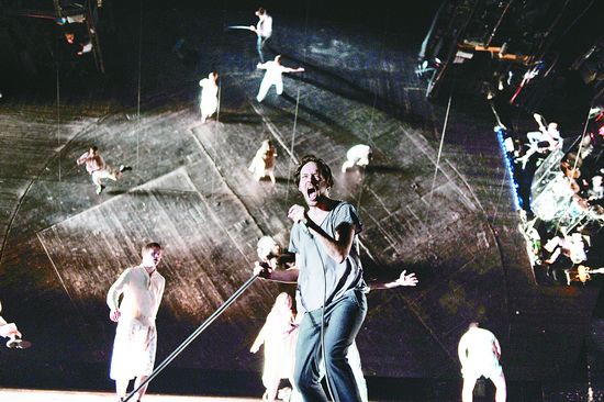 極簡單的舞臺,一面巨大的傾斜的鏡子和會旋轉的地板,幾乎就是舞臺設計的全部。大多數時間,男主演站在臺上,對著一只麥克風朗誦出大段大段的臺詞,情緒爆發時,他會聲嘶力竭,握著麥克風狠狠砸地板,發出巨大的聲響,將一個叫做貝克曼的士兵的焦躁、恐懼、絕望表現得淋漓盡致。