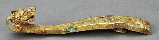 古人身著寬大袍服,因而需要在袍外束帶,使用帶鉤。使用帶鉤的歷史可以遠溯戰國秦漢時期。“教子升天”是宋代以來一直流行的題材,元明時期又借助這一題材順勢制作了鉤首雕龍的帶鉤。明代的帶鉤多由金銀制成,造型與玉質帶鉤基本相同,但僅作龍首,也就不再以“教子”為名。