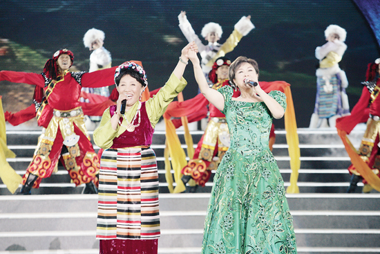 “高原格桑美”為觀眾呈現了一組具有濃郁藏族風格的歌舞組合。來自娘熱、林芝地區的民間藝術家帶來了清新純樸的舞姿,而才旦卓瑪、李谷一、呂繼宏、郁鈞劍、澤旺多吉等新老藝術家演唱的《一個媽媽的女兒》《翻身農奴把歌唱》《歌唱二郎山》《北京的金山上》等觀眾耳熟能詳的經典老歌,以及張也演唱的新創作歌曲《香巴拉并不遙遠》,那親切熟悉的曲調、那金色圣潔的旋律,仿佛涌起陣陣溫情的波瀾,使觀眾徜徉在回想的長廊與遐思的夢境。男聲合唱《天路》以變換的多聲部,雄渾、俊朗、峭拔相交織的音色,將雪域高原的遼遠壯闊、晶瑩無垠,藏家兒女的吉祥祝福、美好祈愿,充滿新意地表現出來。優美的旋律久久在觀眾耳邊回響,深邃的意境則將觀眾的心靈引向遠方。