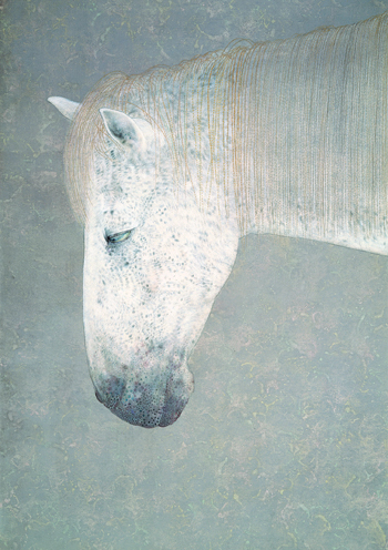 動物畫家竹內浩一反對沒有意義的畫面肌理,積極使用傳統繪畫表現手法。其初期作品受時代潮流影響,色調灰暗,空間寫實。1977年前后,畫家開始反潮流地注重東方傳統,用線以及抽象空間等表現手法,畫面變得純凈、淡雅、細膩,作品中人格化的動物形象仿佛畫家本人憂郁的自畫像。宋代院體花鳥畫對其創作理念的轉變產生了關鍵性的影響,而這一逆時代潮流的選擇幾乎是自然為之,是畫家對人生的思考結果。