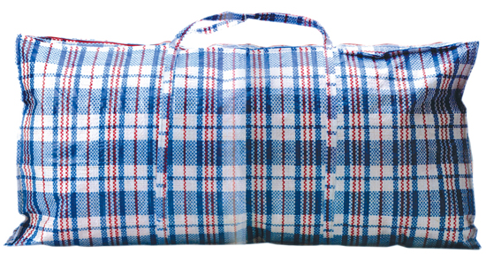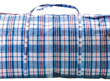 紅藍白三色編織繩編織而成的大袋子。大概是中國民間最常用的一種袋子,它外表和質地頗像蛇皮,俗稱“蛇皮袋”。紅藍白編織袋的性價比很高,它夠大,收容得下棉被和整季的衣服;它夠皮實,搬家時可以將零碎物件一股腦塞進去;它夠低調,是出門遠行打工的最佳搭檔;它夠便宜,用過即棄也不可惜。2007年,這個普通的編織袋,竟然入了奢侈品品牌路易·威登的法眼,其當年新款里就有這樣一個小版的“編織袋”。紅白交替的條紋網格圖案與中國民間廣泛流行的“編織袋”圖案別無二致。普通與時尚之間只有一念之差。