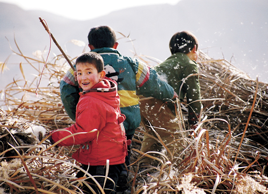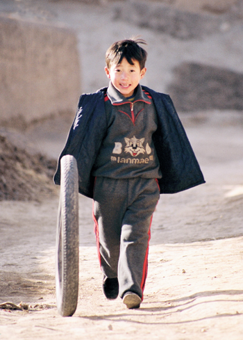 西海固的大部分孩子在整個童年期幾乎是沒有什么玩具的。他們沒有玩具小汽車,沒有玩具沖鋒槍,沒有布絨玩具,似乎也不是什么太大的遺憾,因為在他們小小的年紀(jì)里,早已打下了生活的烙印,他們將會比誰都更早地參加勞動和做家務(wù)。滾滾輪胎,就是他們最大的樂趣。