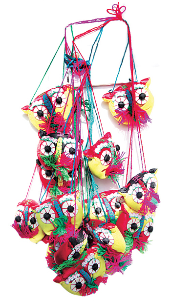 乍見(jiàn)到靈寶的布老虎,就覺(jué)得眼前一亮,并不是這個(gè)地區(qū)的布老虎有多精美或者做工多細(xì)膩,而是它有不同于其他產(chǎn)地的最大特點(diǎn):色彩艷麗的手繪。靈寶地區(qū)有深厚民間美術(shù)和民俗文化基礎(chǔ)?!扒汕伞比藬?shù)多,手藝也多,布藝、剪紙、花饃、紙?jiān)寄苄攀帜閬?lái)。虎形象的表達(dá)因此有了各種質(zhì)地和媒介,單是布藝制品的種類(lèi)就異常豐富,虎形象出現(xiàn)在帽子上、衣服上、肚兜上、圍嘴上、枕頭上、鞋子上。窯洞里擺放一只老虎鎮(zhèn)宅辟邪,曾經(jīng)是許多貧苦人家的理想。