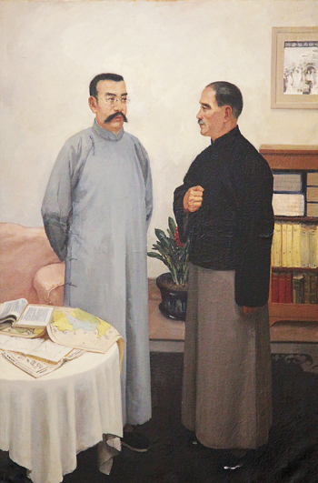 油畫再現了兩位偉人歷史性會晤的一刻。他們一位是中國民主革命的先行者,一位是中國共產主義的先驅,分別是國共兩黨的杰出領袖。1922年八九月間,李大釗在上海與孫中山會晤,商談國共合作,以及改組國民黨建立革命統一戰線的主張。兩人始終互相敬重,精誠相交,有力推動了國共合作事業的形成發展。