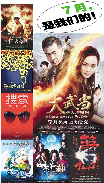 自2006年以后,每年7月暑期檔都是國產影片集中上映期,今年也是如此,優質國產類型商業片趁此機會躍躍欲試。首先,《畫皮Ⅱ》打響暑期檔的第一炮后,多部武打片、驚悚片、動畫片將相繼上映。劉可欣導演,黃渤、季冠霖、王珞丹配音的動畫片《摩爾莊園2海妖寶藏》7月5日上映;梁柏堅導演,趙文卓、楊冪主演的《大武當之天地密碼》7月6日上映;陳嘉上、秦小珍導演,鄧超、劉亦菲、鄭中基、江一燕主演的《四大名捕》7月12日上映;盛志民導演,佟大為、甘薇、秦昊主演的驚悚片《十二星座離奇事件》7月13日上映;除此之外,還有《筆仙》等幾部合拍片。包括《普羅米修斯》《冰河世紀4》《蝙蝠俠前傳3》《特種部隊2》《超凡蜘蛛俠》在內的好萊塢暑期大片都將在這個時間之后才能上映,而7月至少30部國產電影涌入,有媒體、網友語含譏諷地“吐槽”稱,憑借排片優勢,國產片將以不戰而勝的方式成為暑期檔的大贏家,因為進口大片在一段時間內(從6月底《饑餓游戲》等逐漸下線到7月20日《在劫難逃》上映約20天——編者)被屏蔽上映,已然為國產片樹起了一頂風雨不透的保護傘。