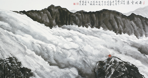 在中國(guó)傳統(tǒng)山水畫中,盡管煙云也是要表現(xiàn)的重要方面,可并不是刻意地表現(xiàn),畫云往往是通過留白以及審美的暗示來達(dá)到表現(xiàn)的目的,這種以虛寫虛、以虛寫實(shí)的畫法在技法上一般都比較簡(jiǎn)單。而王林森畫云,卻試圖用比較寫實(shí)的方法,在畫幅上一筆一筆地把虛無縹緲的云彩畫實(shí),畫出結(jié)構(gòu)和動(dòng)勢(shì),使他的山水畫出現(xiàn)一般山水畫中所沒有的自然景象。為此,他還總結(jié)了一套“畫云二十四訣”,概而言之,就是“拖水帶墨,寫云見筆”。如《云漫井岡》和《廬山云瀑》分別畫出了云彩的不同走勢(shì),一幅是隨山巒起伏向上漫過,另一幅則是順著山勢(shì)凌空而下。像這類有著明顯走勢(shì)的云,其恢宏氣勢(shì)和氤氳氣象,都表現(xiàn)了王林森在畫云方面的努力。