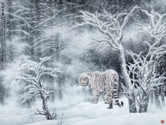 我看馮大中的畫,一個(gè)“情”字了得。他之畫虎也好,畫山也罷,都是內(nèi)心情感的外化,山水、花鳥、獅虎,只是畫家表達(dá)情感的載體。畫之品位、形象生動(dòng),全在畫家的身心投入,這正是中國(guó)傳統(tǒng)藝術(shù)千年之后仍然深深感動(dòng)我們的奧秘所在,它反映出我們的先人對(duì)于自然與景觀的歷史觀與道德觀。馮大中的繪畫,正是他長(zhǎng)期面對(duì)自然寫生、與之交流對(duì)話的結(jié)晶,他畫中的虎,行走于北國(guó)山川、溪畔深巖,有一種與天地同在、威而不露的雄風(fēng),其間多少流露出畫家的人格理想。近年來馮大中的繪畫一方面漸離于事物的常態(tài),另一方面又漸趨于平淡自然。心手相應(yīng)之時(shí),就是心手相忘之際。馮大中的畫并不炫耀技巧和形式,而是表現(xiàn)了漂游四海后對(duì)于人生的深刻感受。中國(guó)藝術(shù)的獨(dú)特性在于“超以象外,得其環(huán)中”的深厚意蘊(yùn),這也意味著現(xiàn)代水墨畫與傳統(tǒng)水墨殊途同歸,最終都是指向人的精神生存。