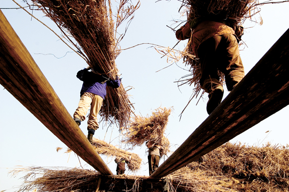 這長長高高的跳板,晃悠悠載著重荷,稍不留神就會從高處摔下來,生死卻只能認命。葦工們就是這樣擔挑、肩扛,搶在汛期前,將蘆葦運走
