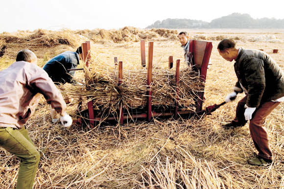 一臺扎葦機,六個扎葦漢子成為一個小組,每天干上10多個小時,每人每天才掙15元