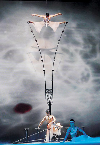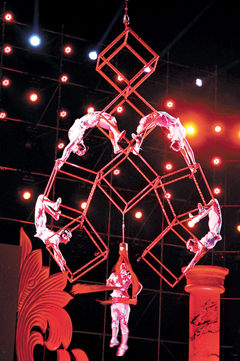 舊雜技最大的問題是“一臺戲”現象,即全國雜技一臺戲、幾十年如一一臺戲,大江南北、長城內外的雜技演出驚人地雷同;去年、今年、明年的節目出奇地一致——一律是碟、碗、凳、桿、繩、圈,鮮有例外,這是雜技過于重技輕意造成的,過于重技直接導致雜技執著于技的錘煉,卻忽視了物的豐富,最終導致雜技語言的單調匱乏。正因為如此,新雜技才會應運而生,重技重意的新雜技的確讓雜苑出現各領風騷、佳作迭出的可喜局面。但是我們必須看到,時時處處一臺戲的局面并沒有徹底改變,碟、碗、凳、桿、繩、圈這些傳統的、舊的物語匯依舊在劇目語言系統中占據著霸主地位,新語匯少之又少,其結果便是語言表達方式雷同單一。這樣的狀況必然會抑制觀眾進劇場觀看雜技的熱情。