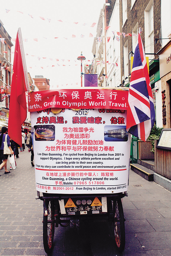 最近在倫敦中國城的一個(gè)老爺爺“火”了。自2001年開始,他從北京出發(fā),一路騎著三輪,騎行14萬余公里,在今年終于抵達(dá)倫敦,支持綠色奧運(yùn)。貼滿一路風(fēng)景圖片的三輪車上,還打出了這樣的標(biāo)語:“希望每個(gè)運(yùn)動(dòng)員都能為自己的祖國爭光。”他祝福所有的運(yùn)動(dòng)健兒,宣揚(yáng)世界的和平與環(huán)保,真是相當(dāng)大氣。