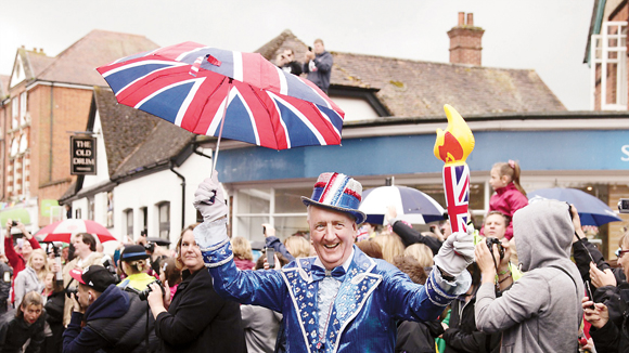 據(jù)2012倫敦文化節(jié)官網(wǎng)介紹,奧運(yùn)圣火抵達(dá)英國漢普郡的彼得斯菲爾德(Petersfield)時(shí),居民們沖到大街上狂歡慶祝,甚至有人站到屋頂上拍照。圖為一位當(dāng)?shù)鼐用袷⒀b迎接火炬到來,一手握著充氣火炬,一手舉著米字旗圖案的雨傘,滿臉喜悅。