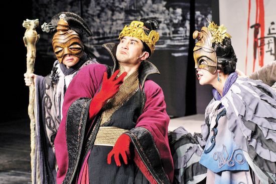 日前,從王曉鷹版《理查三世》赴倫敦參加“倫敦文化奧林匹亞”之環球莎士比亞戲劇節載譽而歸,到該劇在北京首都劇場上演,拉開北京人藝60周年精品劇目邀請展演的序幕;同時,在不久前舉行的第四屆全國少數民族文藝會演上,由王曉鷹執導的講述“戰爭與和平”艱難抉擇的重慶市原創歌劇《釣魚城》榮獲本屆全國少數民族文藝會演劇目金獎,包攬最佳編劇、最佳導演等在內的6個單項獎。當西方經典遭遇中國文化,當中國傳統經典面對當下的時代,如何以現代眼光看待、解讀、轉化傳統經典,使其在新的歷史視野下實現“華麗轉身”?