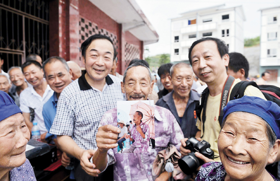 在涪陵移民新村送作品現場,78歲的何本信拿著攝影志愿者為他抓拍的一張彩色相片,笑呵呵地說:“這是我這輩子頭一回照彩色相片喲!拿回去慢慢看!謝謝你們,謝謝黨和政府的關心!”