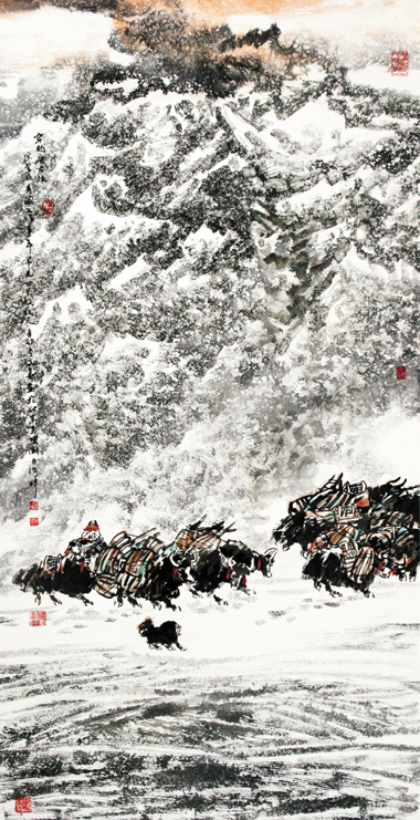 高原系列中運用嶙峋怪石似的寫意和層層積染的積墨筆法,使得這種占領顯得更為簡潔和犀利,省去了所有枝蔓和過程,直搗黃龍。中國畫是一個感性認知過程的表現,所要刻畫的不是物理客體,而是內心的認知,“因心造境,以手運心”。比之西方繪畫,中國畫更多強調的是心的感悟,而非手的繪畫制作技巧。“知畫之為物,是性靈者也,思想者也,活動者也,非器械者也,非單純者也”。用自矜的話來說,中國畫需要更多的自我修養和更多的文化,所以“文人畫”便成了中國繪畫的一種標高和標志,成了藝術與匠人之間的分野,正如張彥遠《歷代名畫記》所云:“自古善畫者,莫非衣冠貴胄,逸士高人,非閭閻之所能為也。”寫意技法便是文人畫思想的物質手段,是感性認知的技術表現。作為一介“文人”的張文華,在高原的幾年游蕩中,他帶著從學院中練就的寫實基本功,在離天最近的地方,感受和體悟著高原的凄寂與悲壯,尋找著最貼切的語言表達形式,思考著藝術本體中的許多問題,此時,只需心在高處。所以高原系列要傳遞的并非高原美景,而是對這種景致真切感受。山峰如戟,天空如染,草原如涌,這種快捷和酣暢的筆法的確給人以強烈的視覺沖擊,這不僅可以更為真切地表現青藏高原荒野蒼茫的粗礪質感,而且也更能契合中國畫中“不下堂筵,坐窮泉壑”的意趣和境界,誠所謂“畫者不過意筆草草……寫胸中逸氣耳。”