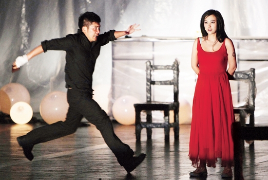 8月7日,由孟京輝執導、廖一梅編劇的話劇《戀愛的犀牛》在北京保利劇院完成第1000場演出,演員張念驊、郝蕾出演男女主角,導演孟京輝客串演出。圖為《戀愛的犀牛》演出現場。