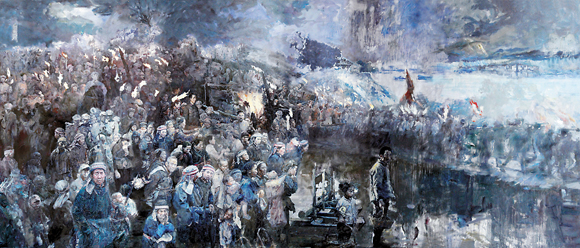 那是個星期天的早晨,當我又一次將畫框抬起準備架到乳膠桶上時,由于角度太直,7米寬、3米高的畫框晃動著、扭曲著,最后反扣著倒向地面。天哪!地面上散落著調色板、箱子、刮刀、畫筆、擦筆紙,而那顏料未干的畫面!這刻畫細致的人物!……我用肩膀扛著底部的邊框,用余光搜尋調色板的位置,摸索著抓住然后用力地將它扔出去,用腳鉤出小木箱,將倒扣著的畫框慢慢地架在木箱和乳膠桶上,然后趴在地上窺視畫面。謝天謝地,除了局部粘了一些雜物外,整體畫面并沒有被破壞。我將畫框的底部放回地面,將畫框的頂部架在兩個梯子上,左右抬升,當升到一定高度的時候,再用力地從中間的木框上往前推,畫又立起來啦!此時的我已大汗淋漓、氣喘吁吁。