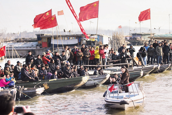 2008年2月,文藝工作者在江蘇淮安水鄉慰問,歌唱演員在小船上為群眾演唱 王 雨 攝