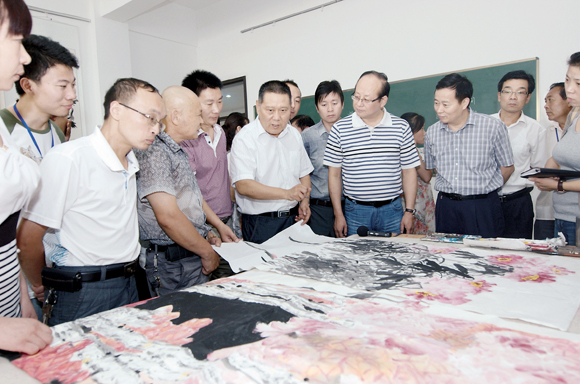 在平樂村牡丹畫創意園區,急切等待指導的農民畫師不僅站滿了幾間大畫室,還把大廳也擠得滿滿當當。藝術家們每到一處,都被大家熱情地圍住。“這里的牡丹葉子太大了,不像。”“這幅畫比較寫意,市場還是更需要寫實的畫法。”“以后要學著用重墨畫些竹葉穿插,可以為畫提神。”對每一幅畫,河南省文聯主席、美協主席馬國強等畫家都給出具體的指導意見。許多受過點評的畫師仍然不愿離去,還湊上去想聽聽專家對別人的指導,再多學一些。聽說省里著名畫家要來指導,許多農民畫師提前一天畫好了許多幅作品。逯躍松提前畫了5張,想讓專家看看、評評,甚至添上幾筆。“專家都看了,但是時間緊,就重點選了一張作修改。”他說:“原畫有些單薄,經過專家修改,畫面就比較完美了。”